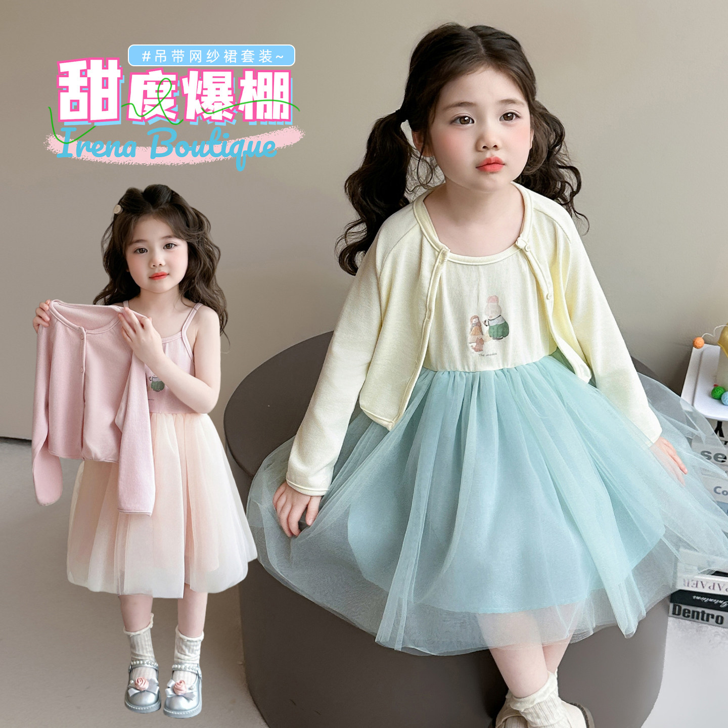 女童连衣裙套装春夏新款儿童甜美网纱裙子女宝宝吊带裙开衫两件套