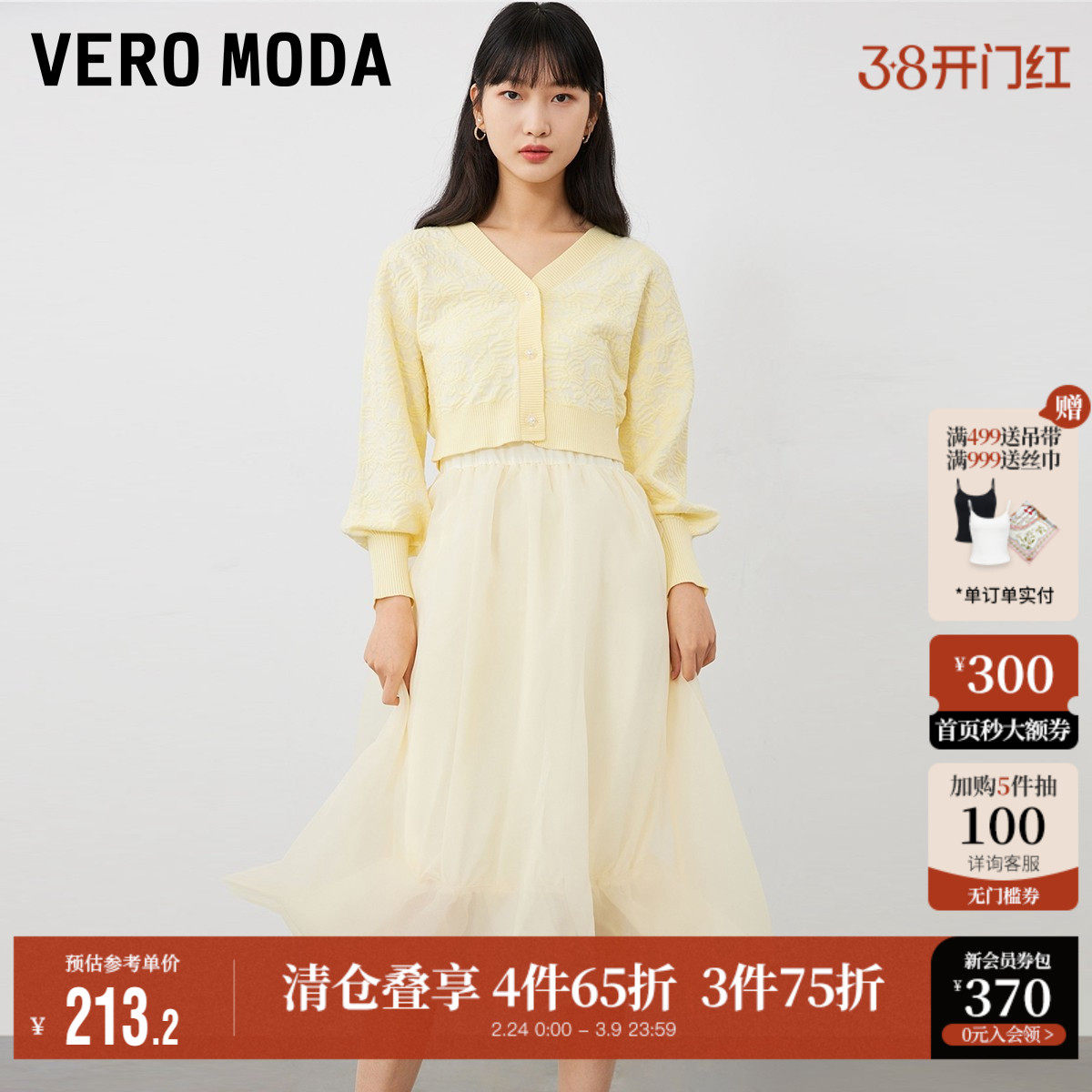vq区绫致Vero Moda针织连衣裙24秋冬v领针织衫网纱裙两件套战袍