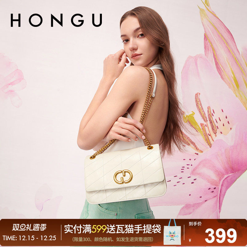 HONGU红谷女包包牛皮单肩斜挎链条小方包时尚百搭休闲腋下包包