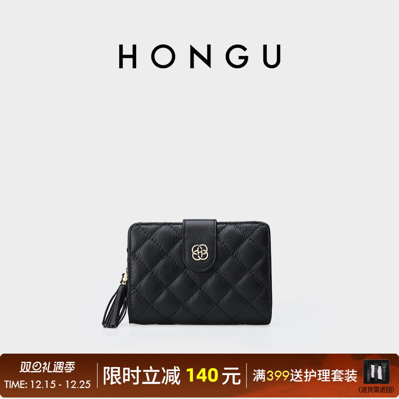 HONGU/红谷钱包女新款菱格小香风牛皮百搭拉链短款简约钱包夹卡包