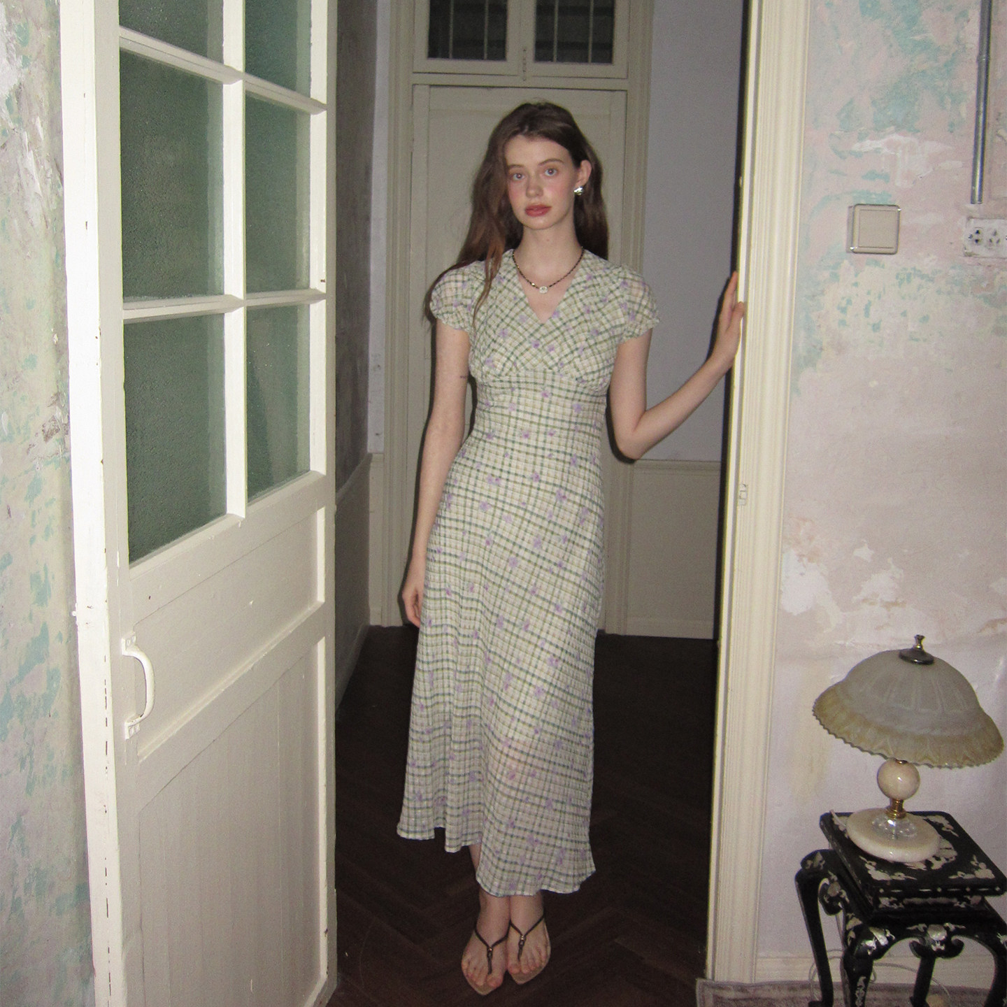 ZHUYIYI 新款法式格子短袖连衣裙女夏收腰显瘦长款原创设计长裙