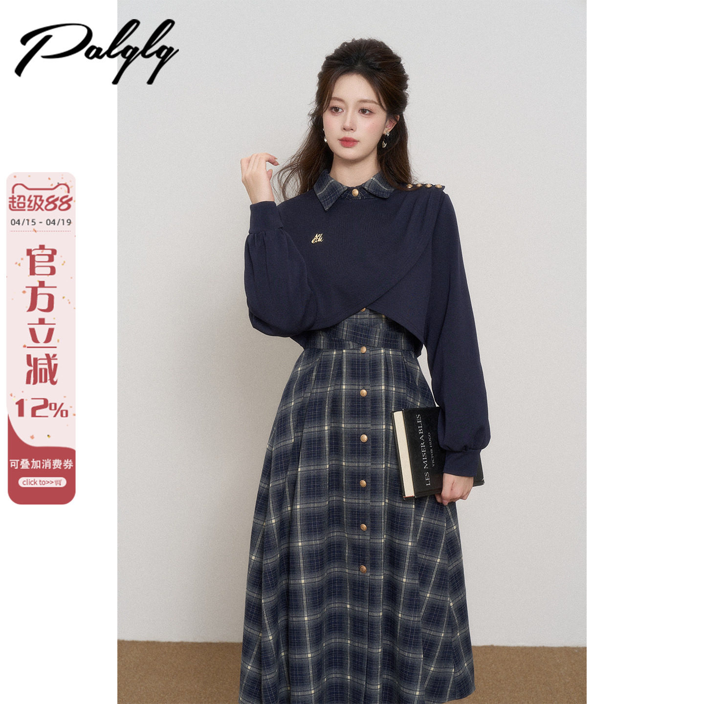 学院风蓝色格子长袖连衣裙女秋季设计感小众气质收腰显瘦打底长裙