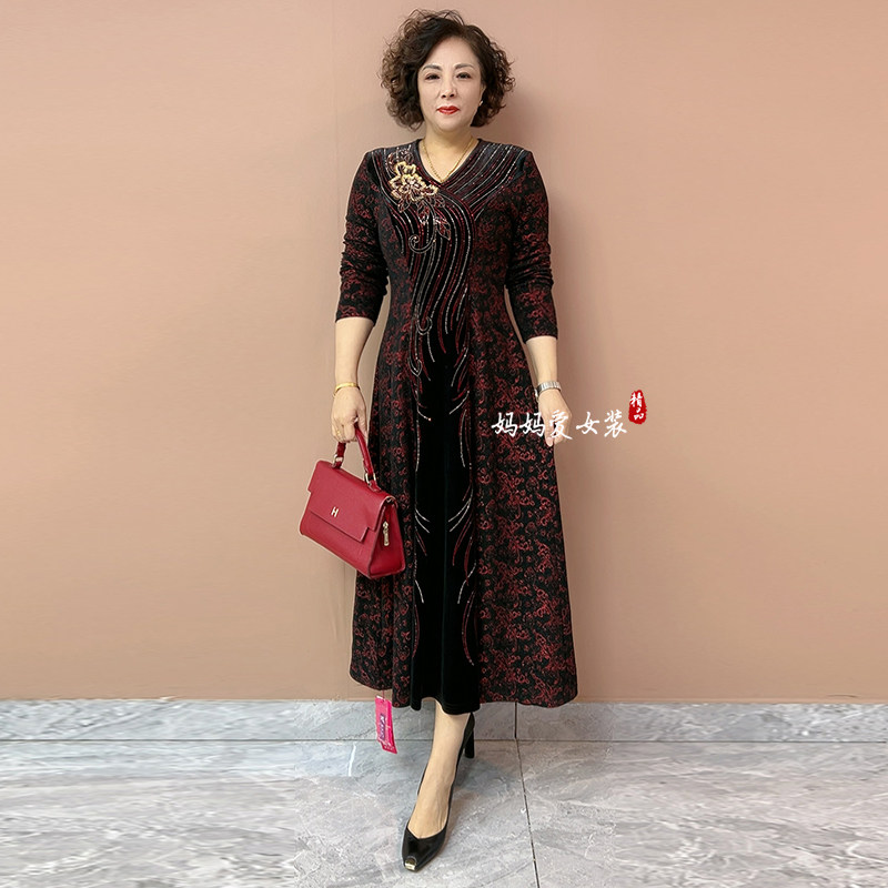 高端贵气妈妈春秋连衣裙南韩丝镶钻裙显瘦遮肉贵夫人打底时尚长裙