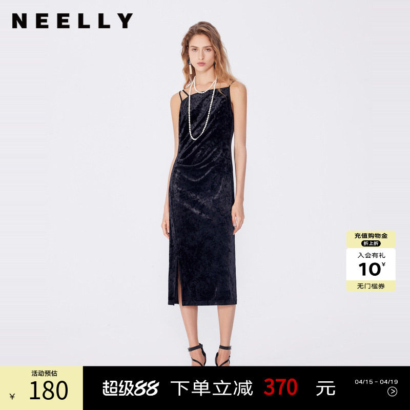 NEELLY纳俪春秋新款商场同款设计感吊带连衣裙女黑色内搭收腰长裙