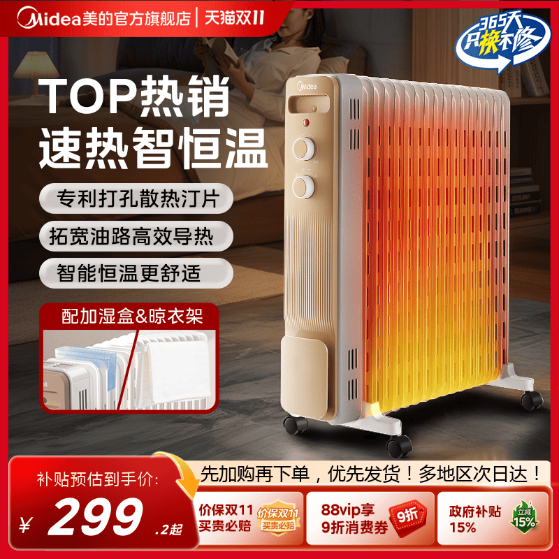 美的取暖器家用油汀暖气省电暖风机电暖气电暖器客厅烘干暖炉油丁