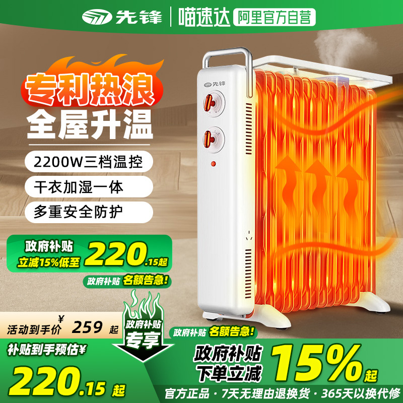 先锋油汀取暖器速加热油丁片电暖气风机烤火炉家用冬季烘干衣卧室
