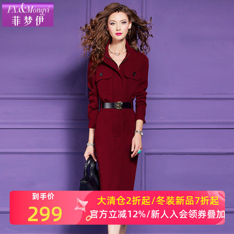 菲梦伊红色连衣裙女秋装新款法式优雅松驰感收腰气质中长款包臀裙