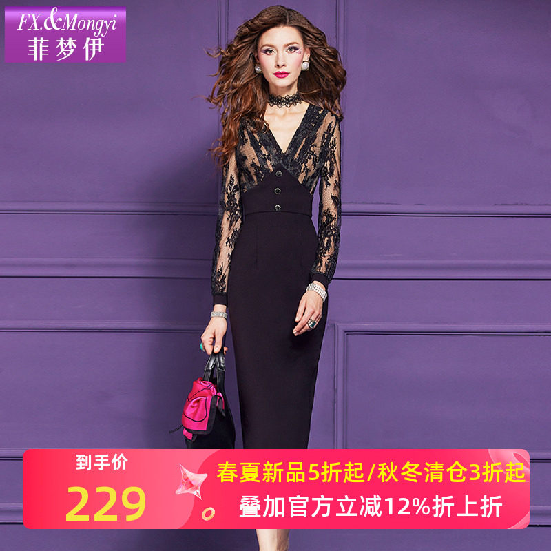 菲梦伊蕾丝边黑色连衣裙女长袖秋装法式性感高级收腰V领包臀裙子