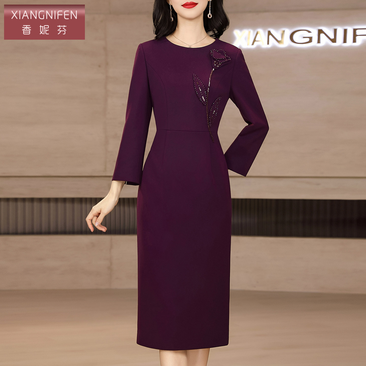 香妮芬高端钉珠气质中年妈妈连衣裙女2026新款春秋修身收腰包臀裙
