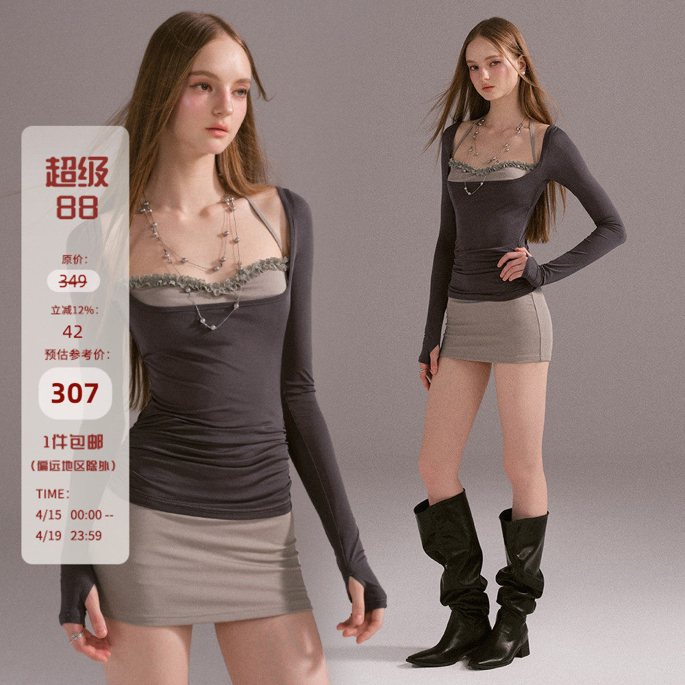 Mess Studio 辣妹设计感短款修身假两件撞色蕾丝包臀连衣裙女春秋
