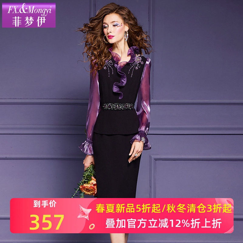 菲梦伊钉珠荷叶边连衣裙女长袖秋装法式高端精致收腰包臀裙职业装