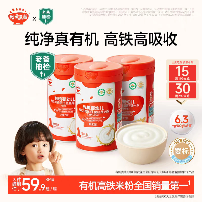任选3件】秋田满满有机高铁婴幼儿米粉维C加铁益生菌米糊宝宝辅食