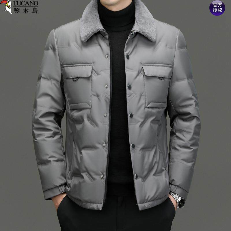 啄木鸟中年男士外套白鸭绒带毛领羽绒服翻领夹克冬爸爸装保暖外套