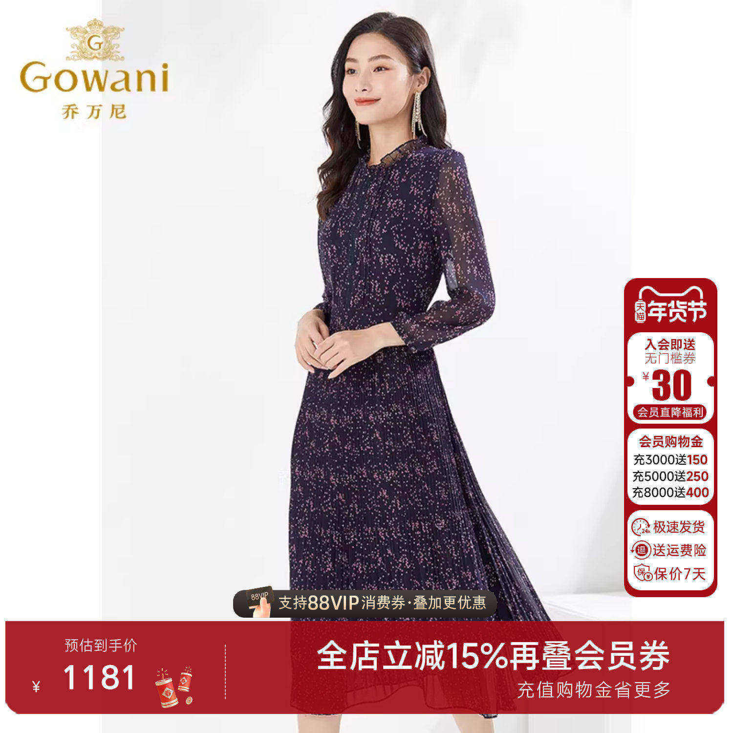 乔万尼连衣裙好看流行商场同款气质百褶长裙长袖碎花长裙EI3E126