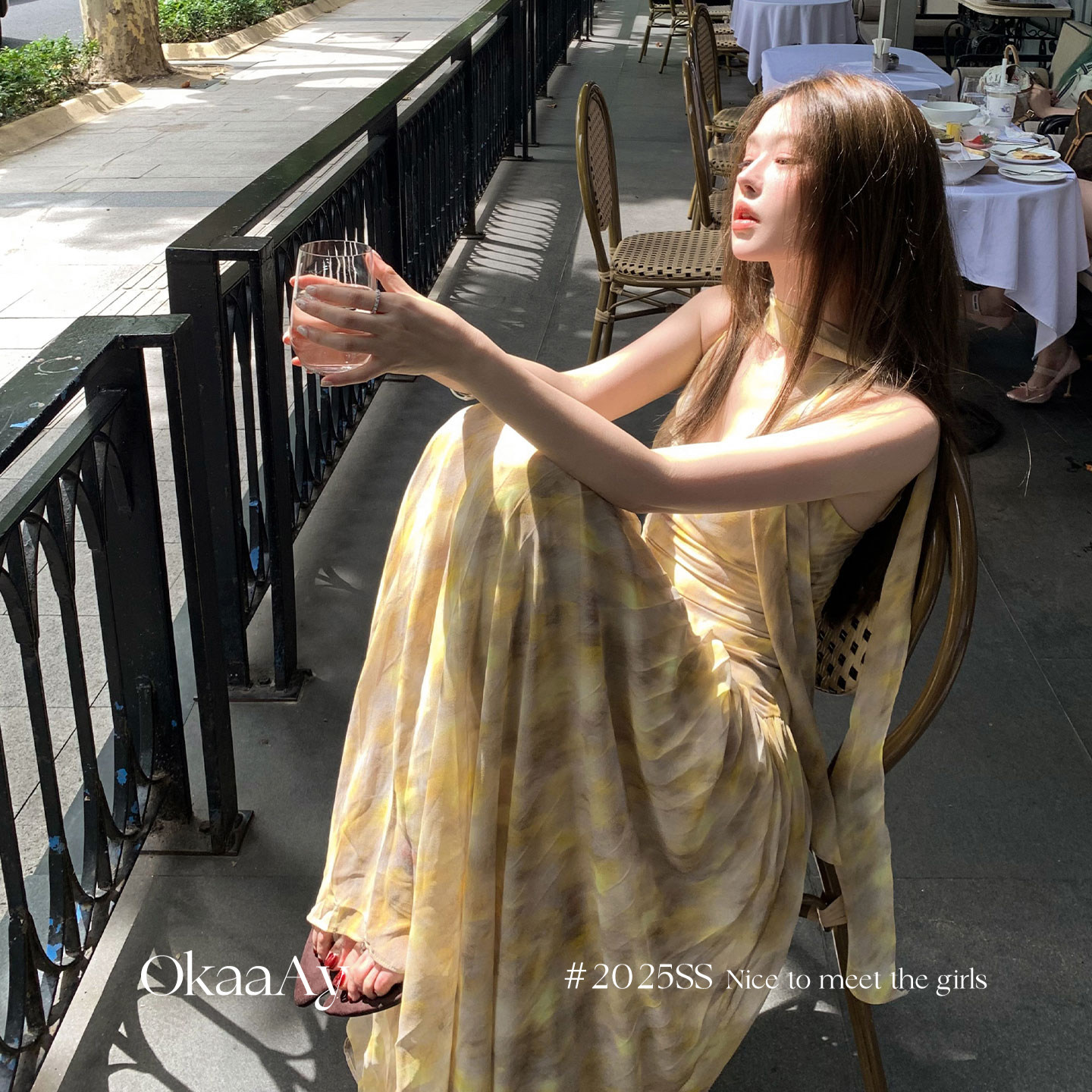 Okaaay 【轻纱漫舞】法式碎花晕染飘带V领吊带连衣裙大摆百褶长裙