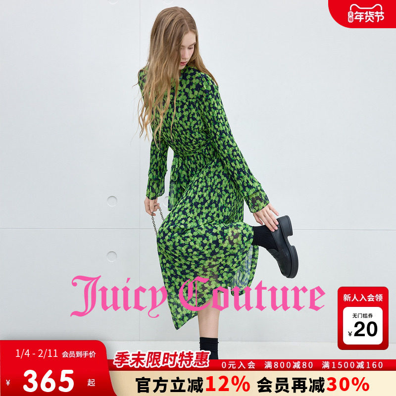 Juicy Couture橘滋连衣裙女25秋冬新款飘逸绿色碎花网纱百褶长裙