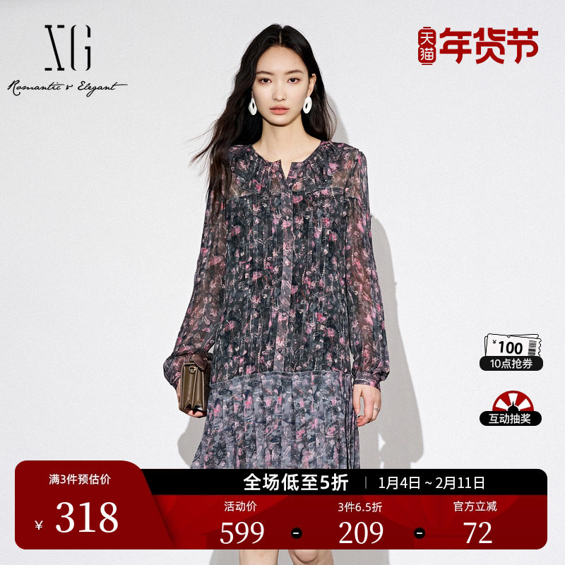 XG雪歌荷叶领设计长袖连衣裙时尚秋季新款碎花长袖短款百褶裙女装