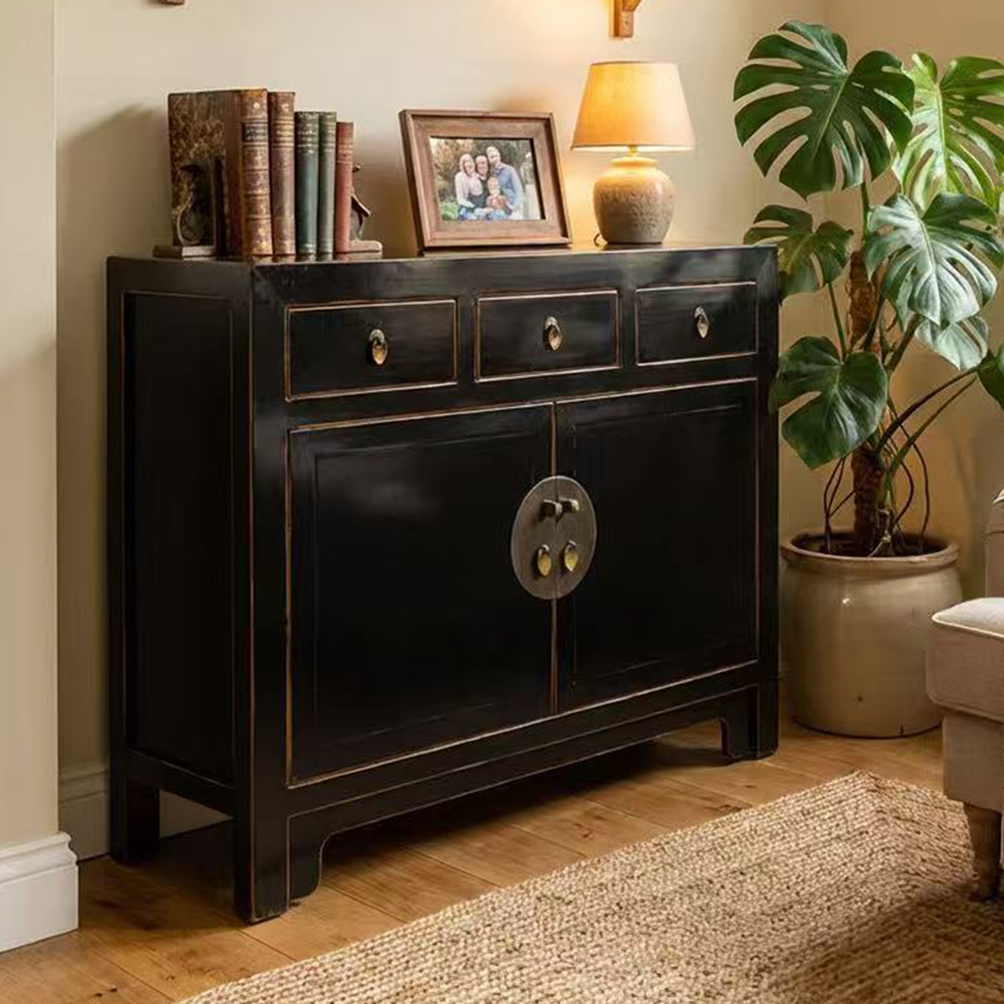 新中式餐边柜酒店备餐柜黑色磨边做旧门厅柜防古实木摆件2026新款
