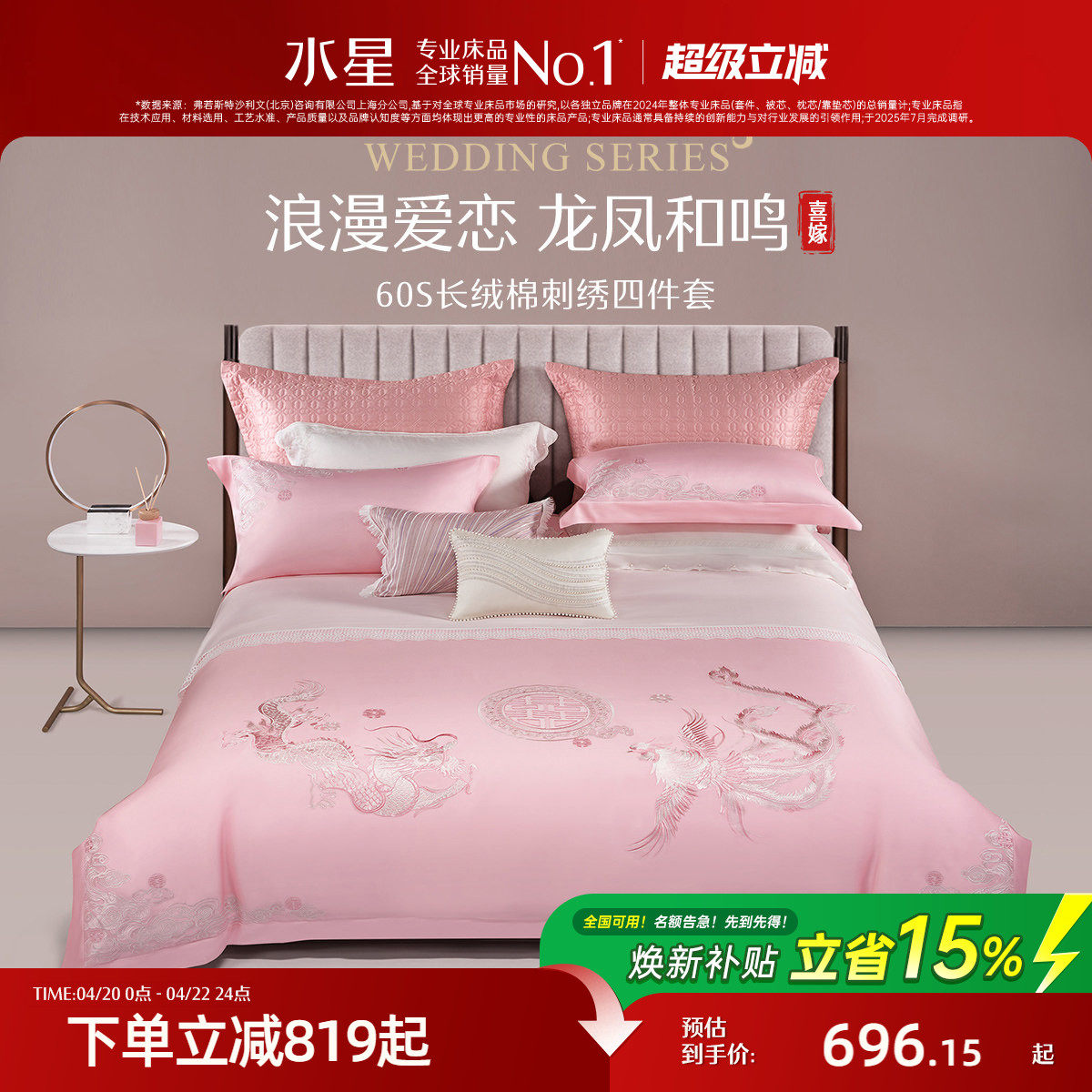 水星家纺60S长绒棉婚庆四件套结婚套件粉色婚嫁被套床单轻奢床品