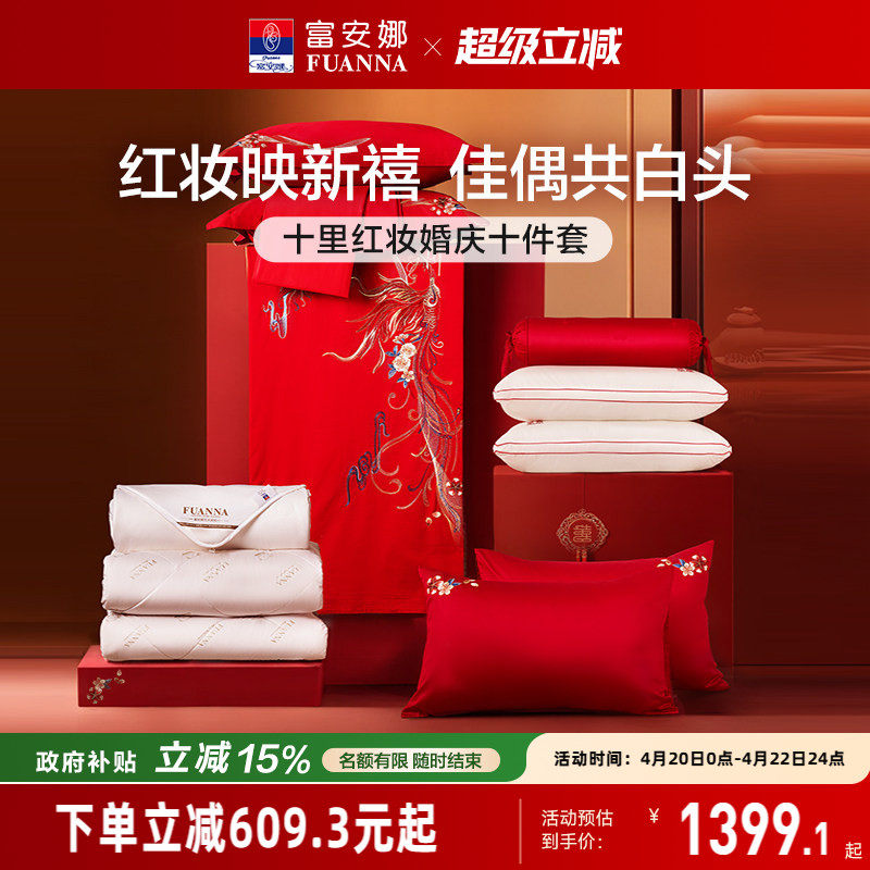 富安娜婚庆套件红色纯棉结婚床上用品轻奢提花喜庆婚嫁婚床单被套