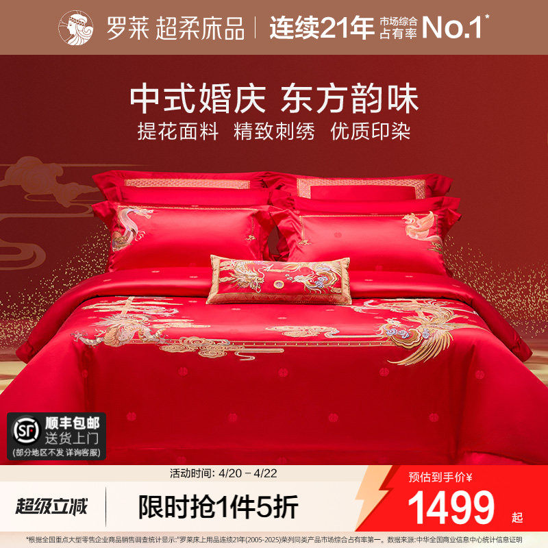罗莱家纺结婚四件套全棉喜庆婚庆婚床上用品大红色囍嫁婚庆六件套