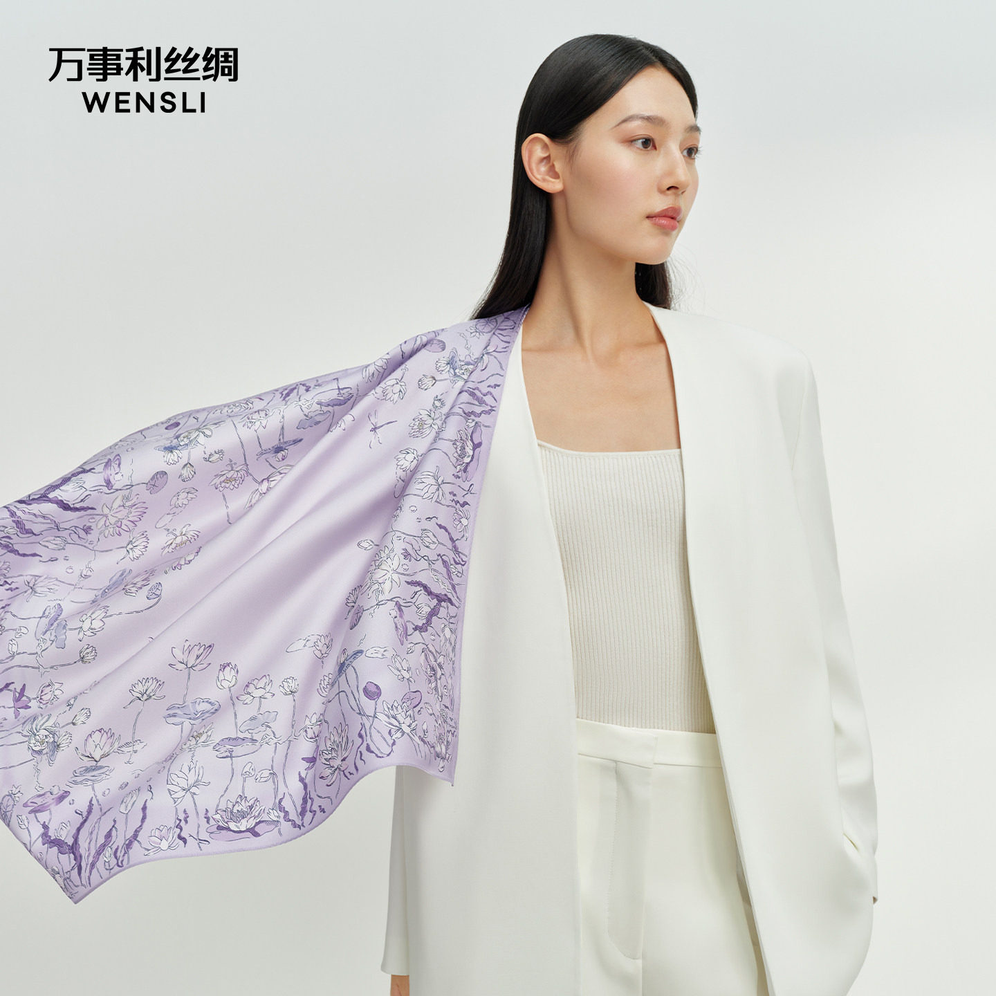 万事利26春夏新品真丝丝巾印花卷边中方巾围脖女送礼礼盒荷风吟