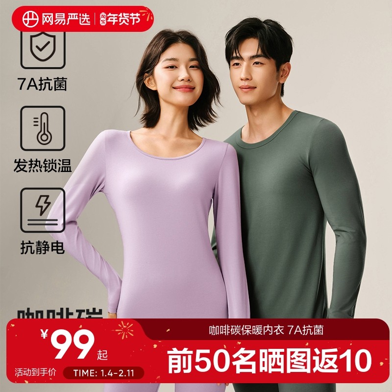 网易严选咖啡碳保暖内衣情侣秋衣男士女秋裤加绒圆领长袖2025冬