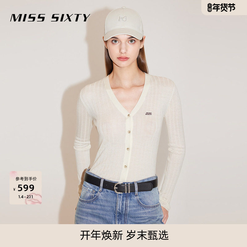 Miss Sixty羊毛针织衫女刺绣修身显瘦性感V领上衣外套毛衣