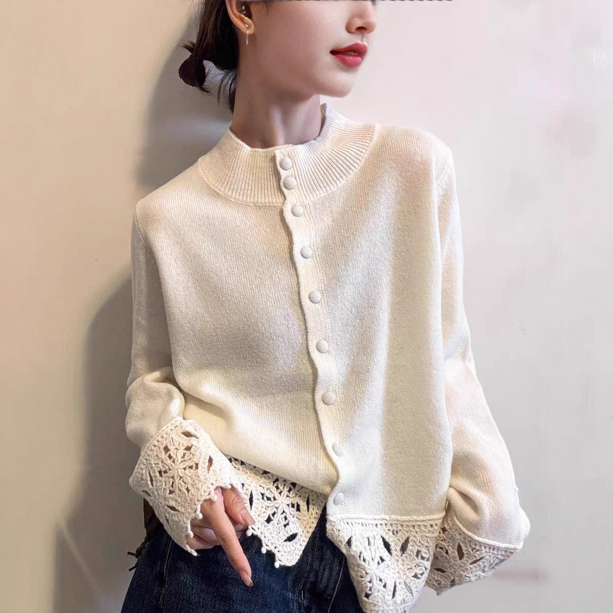 100%纯羊毛衫高端小资花边下摆蕾丝花边开衫外套毛衣上衣洋气女装
