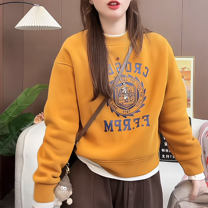 慵懒风姜黄色圆领卫衣女秋冬新款时尚宽松休闲加绒打底衫套头上衣