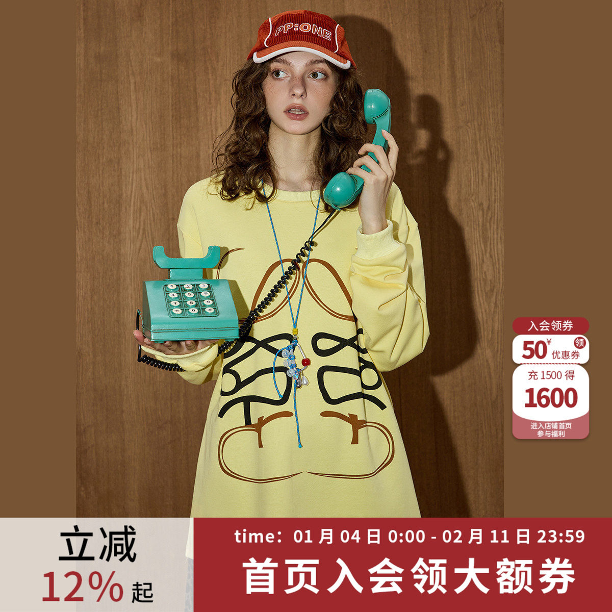 小吉家大码女装黄色长袖卫衣秋冬可爱印花宽松慵懒风圆领套头上衣