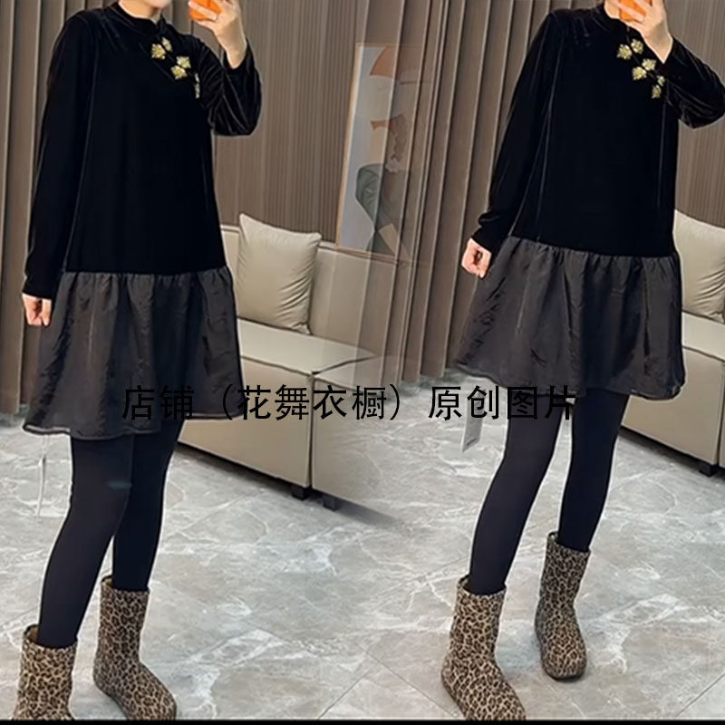 新中式重工欧根纱拼接丝绒连衣裙女设计感高级黑色长袖裙大码时尚