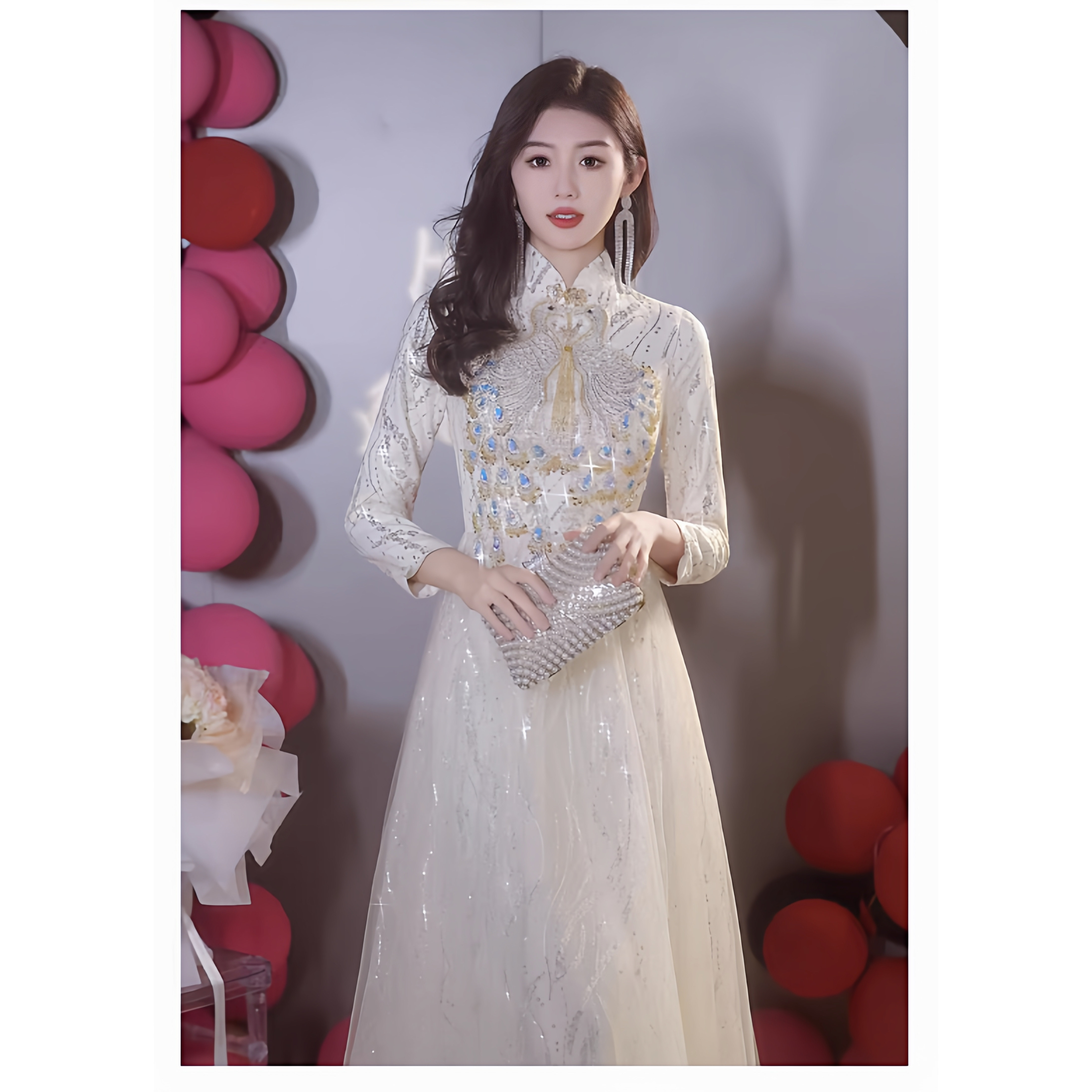新中式挂脖长袖亮片礼服女高级感轻奢年会香槟色欧根纱刺绣连衣裙