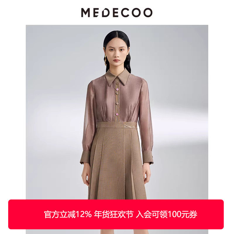 MEDECOO/墨蒂珂2025春季新款欧根纱拼接长袖衬衫领连衣裙MIC90413