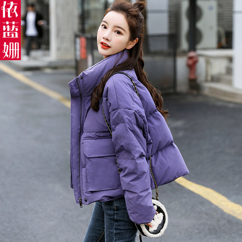 紫色短款羽绒棉服女2021新款冬季韩版时尚气质a字宽松小个子外套