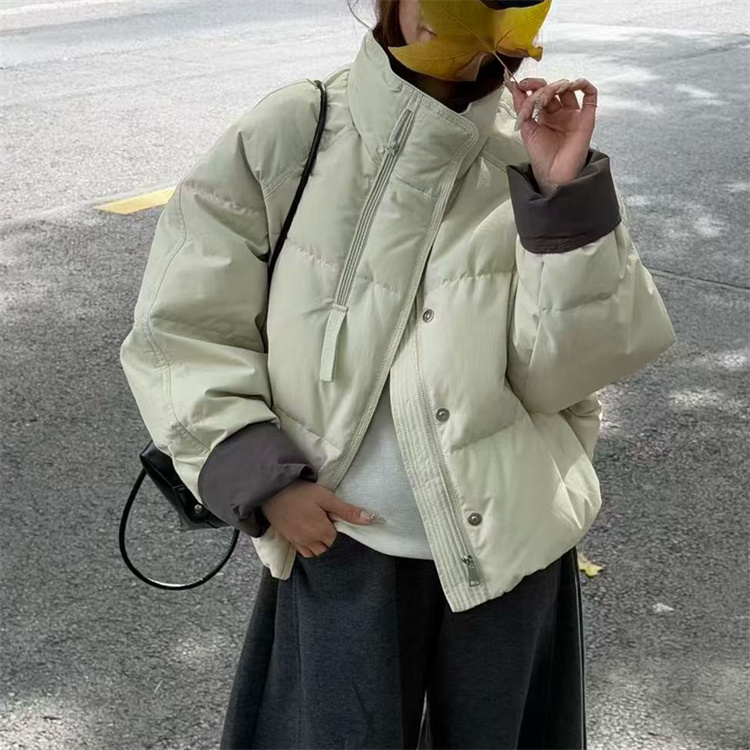 韩国25冬装新款胸前半截拉链撞色卷边袖时尚韩版A字娃娃款羽绒服
