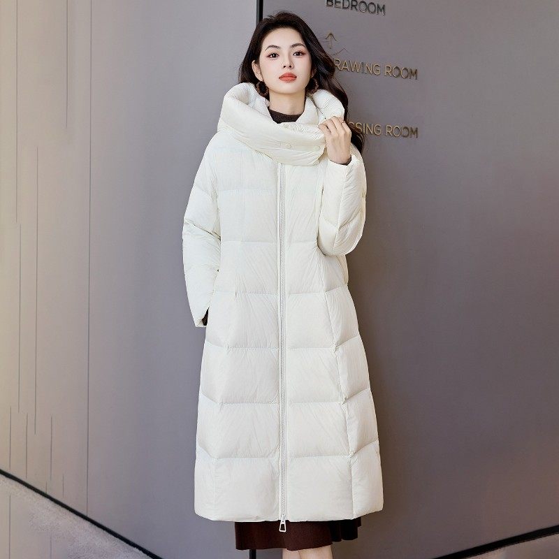 - 长款连帽过膝羽绒服女