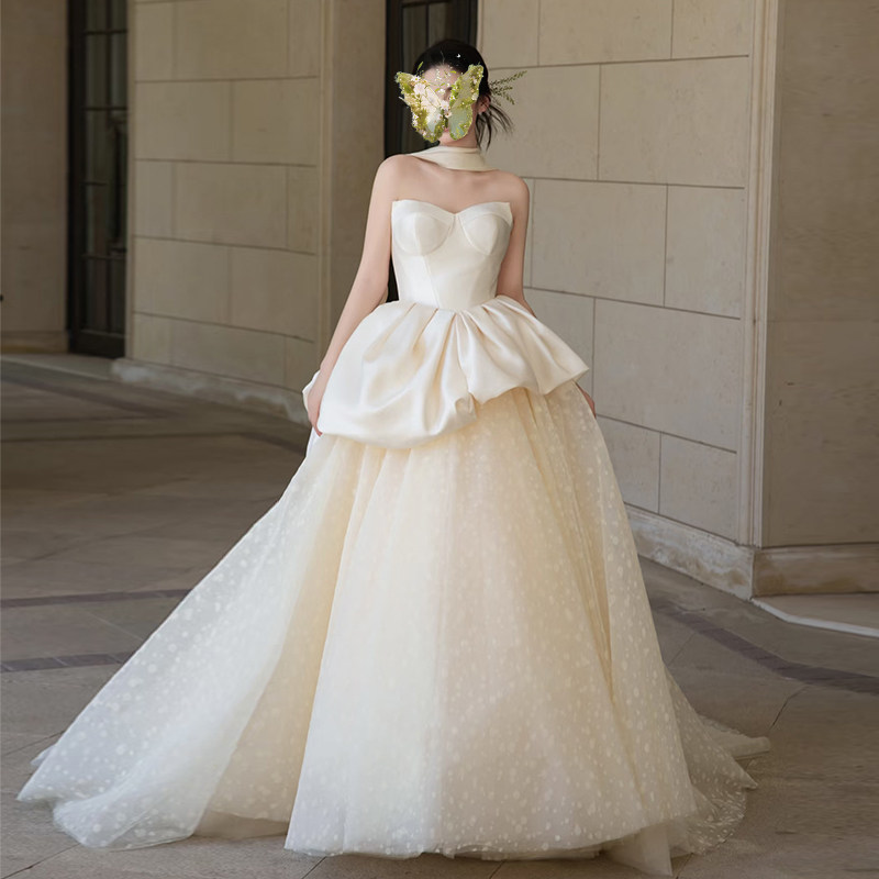 抹胸婚纱缎面法式新款新娘简约蓬蓬裙高级质感主纱定制拖尾出门纱