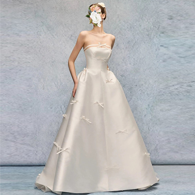 法式抹胸缎面婚纱新娘2025新款高级感出门纱简约气质白色拖尾礼服