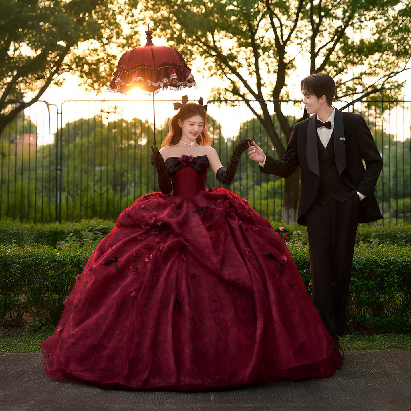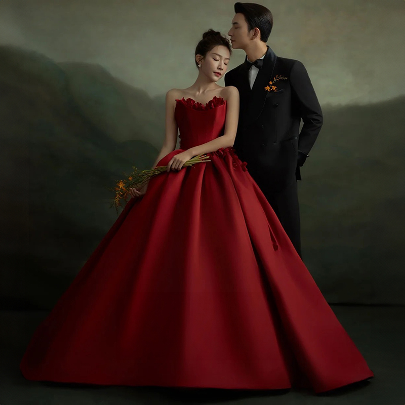 影楼主题拍照服装拖尾礼服酒红色情侣旅拍写真油画风唯美抹胸婚纱