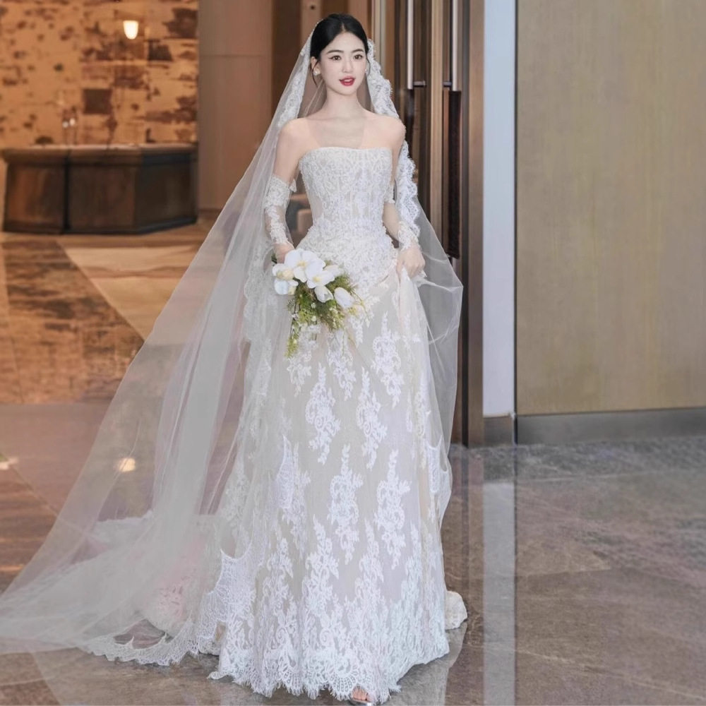 2025新款抹胸公主婚纱礼服新娘主纱蕾丝刺绣拖尾高级质感轻奢主纱