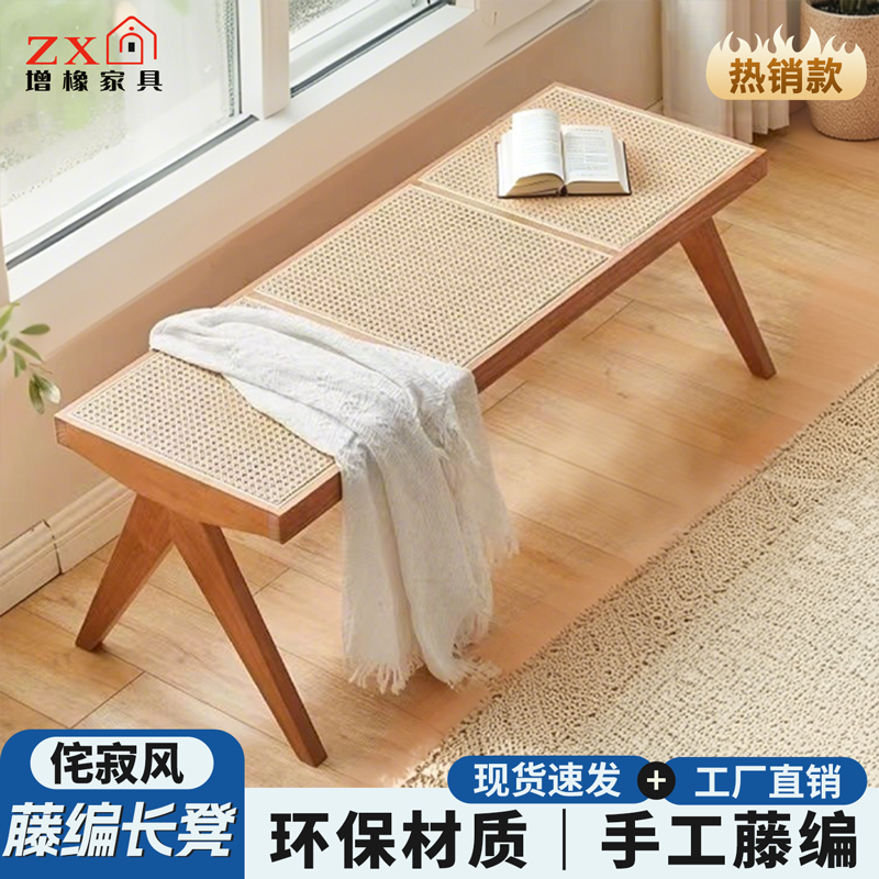 侘寂风藤编长条凳实木床尾凳手工编织藤编长凳家用设计师款换鞋凳