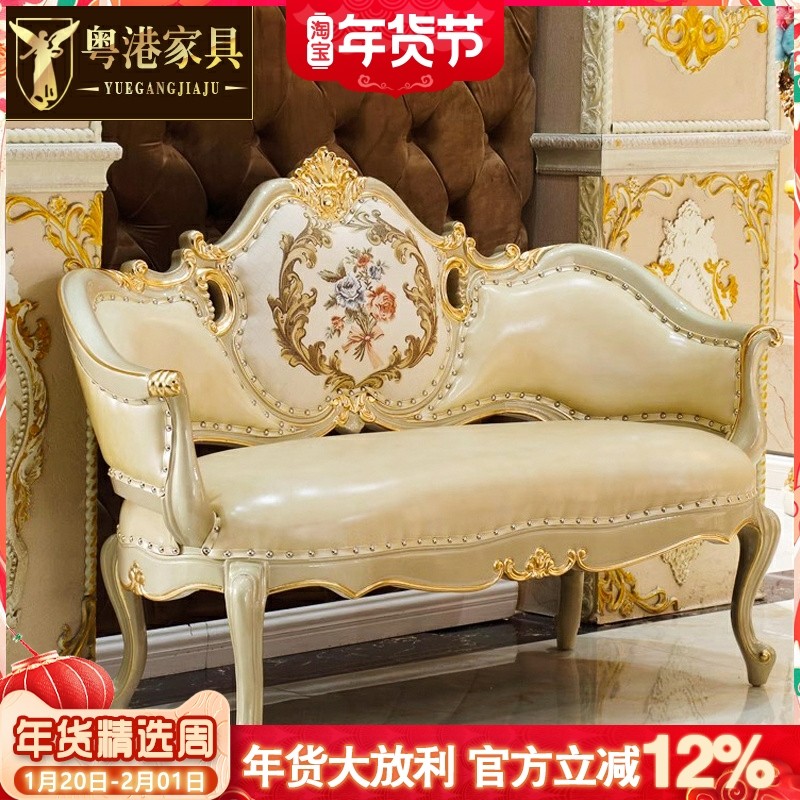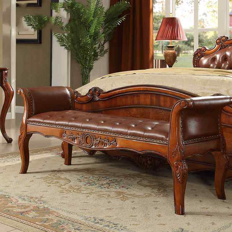 欧式实木床尾凳小沙发头层牛皮躺椅高档奢华贵妃椅双位休闲椅脚踏