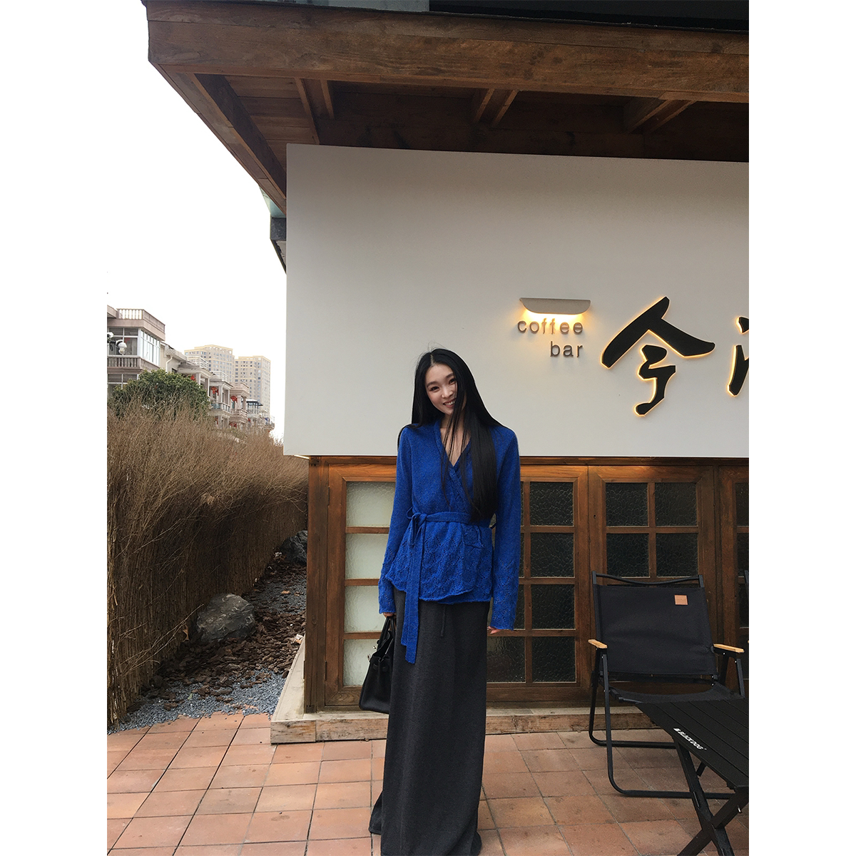 黄亮Elovey 宝蓝色针织开衫系带毛衣+长款半裙两件套套装气质显瘦