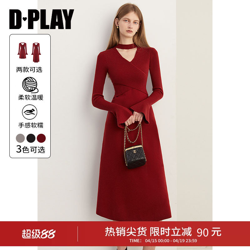 DPLAY气质复古红色连衣裙女法式订婚长款针织毛衣裙2026年春