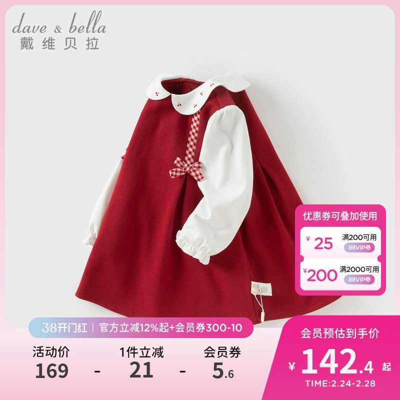 戴维贝拉女童连衣裙春装儿童新年红色公主裙周岁女宝礼服裙子洋气