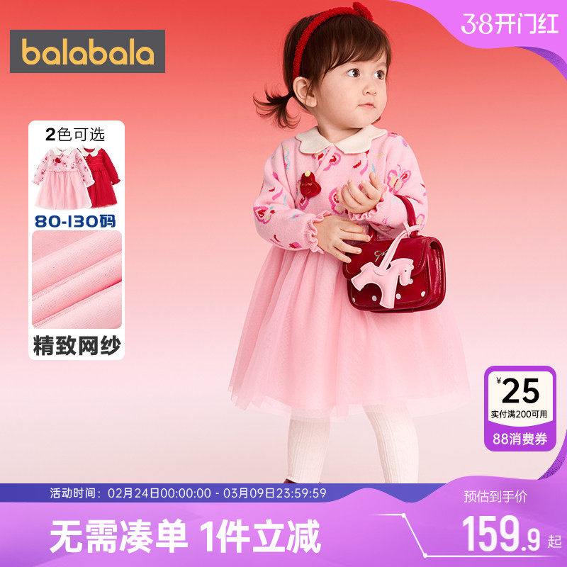 巴拉巴拉童装女童连衣裙2026新春秋装网纱儿童裙子新年红色公主裙