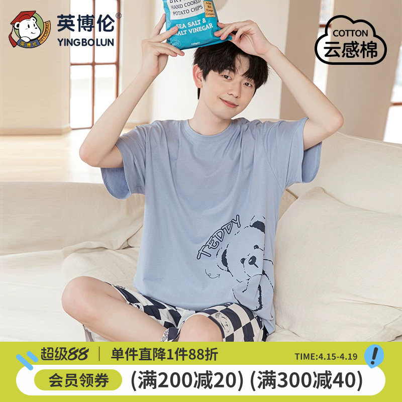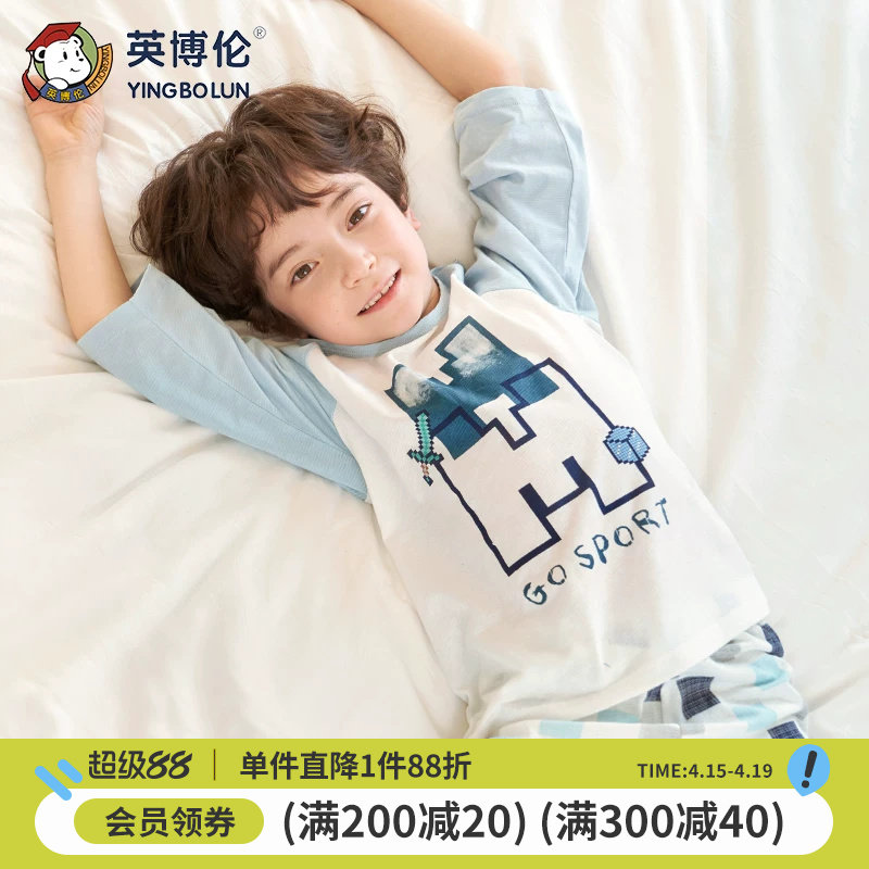 英博伦夏季纯棉男童睡衣青少年男薄款家居服男大童短袖套装空调服