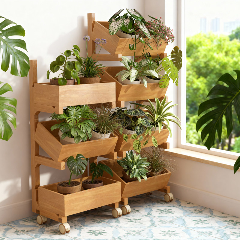 带轮阳台木质花架落地式靠墙多层可折叠阶梯移动绿植花盆置物架子