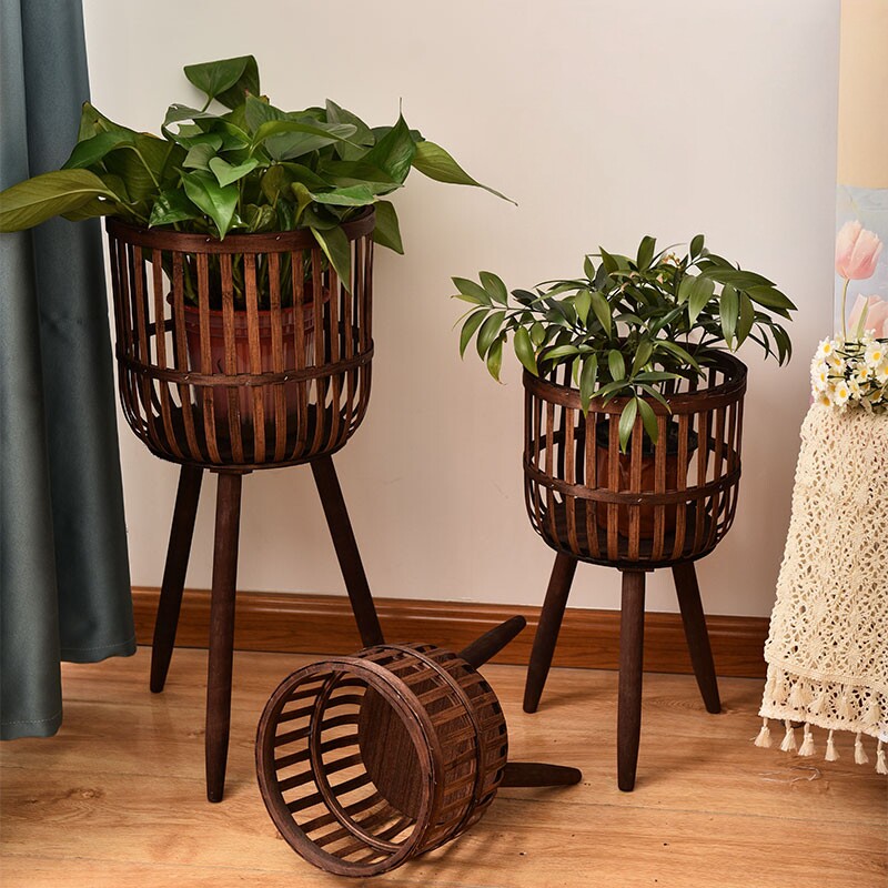 北欧创意藤编竹编草编花篮木质高花架落地式室内客厅装饰绿萝花盆